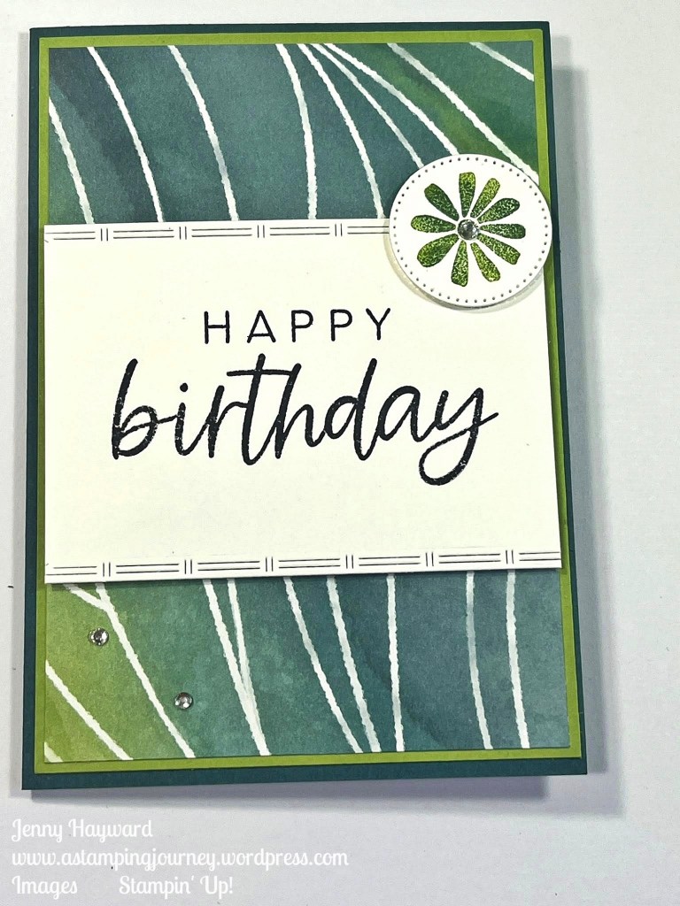 Take a closer look at the “flowery” shape in the circle. Rather than just simply stamping it I added extra colour. Firstly, it was inked in Granny Apple Green and then I used a dauber to add some Pretty in Peacock in areas over it. You only need a little dab of ink. Then it was diecut with one of the small circles in the Stylish Shapes Dies.
