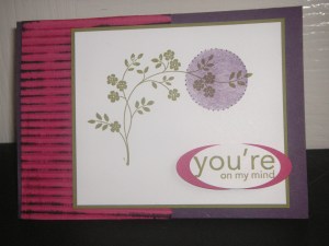 After I stamped the tree from Thoughts and Prayers, I masked a circle and sponged lightly in the circle with the Elegant Eggplant Ink.  Then used the fine point on the marker and dotted around the circle.  Ipunched 2 ovals from the large oval punch and layered them under the Whisper White oval that I had stamped the greeting on.  I mounted them up on dimensionals.  I crimped the Rose Red strip and swiped the Elegant Eggplant inkpad over to pick up the ink on the crimped edge.