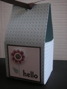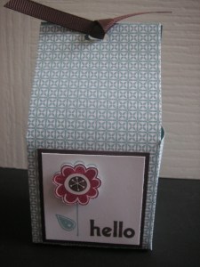 In this recent post I showed you the boxy bags. They are so cute. I said I would give you the metric measurements for them and I haven’t forgotten. I’ll do that right now for you. I will show you the bag I made some time ago when I tried these the first time. I made this one for a special friend using the stampset “Hello Again”. It was good I had a photo in the vault!