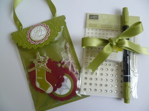 The pack includes a Mini Bag with Christmas Tags, 1 pack of Adhesive Rhinestones, 1 Old Olive Stampin’ Spot and an Old Olive Marker.