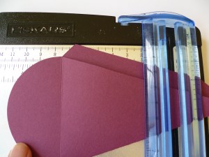 3. Move the piece along the cutter to the 5cm (2″) mark. Have the score line running vertical again at this mark. Have the point of the tab running up against the grid on the cutter. See the photo again for placement. Now score the card piece. I use my bone folder some people have the scoring blade on the cutter.