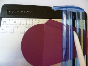 2. Place ONE of the pieces in your cutter. Place the score line at the circle end at the 7.5cm (3″) mark. The score line must run Vertical in the cutter. (This is really important). Have the point of the tab resting against the grid at the top. Check the photo for correct placement. I hope this is clear enough. Once in position cut the card piece. Do this with both pieces.