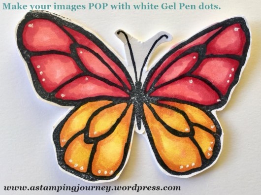 The other day I was colouring the butterfly from the Beautiful Day set with the Stampin’ Blends. I had an idea to add a few dots to it with my White Gel Pen. I thought it added a little something to the image and thought you might like to see it.