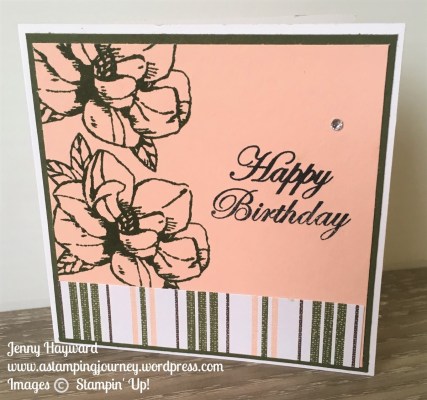 Being a quick card I didn’t want people to be colouring the flowers in. There wasn’t time for that and for beginner’s that can be challenging. The small magnolia flower was stamped on the Petal Pink card mat in Mossy Meadow twice on the left hand edge. Reinking the stamp each time before stamping. The sentiment is stamped in Memento Black ink.
