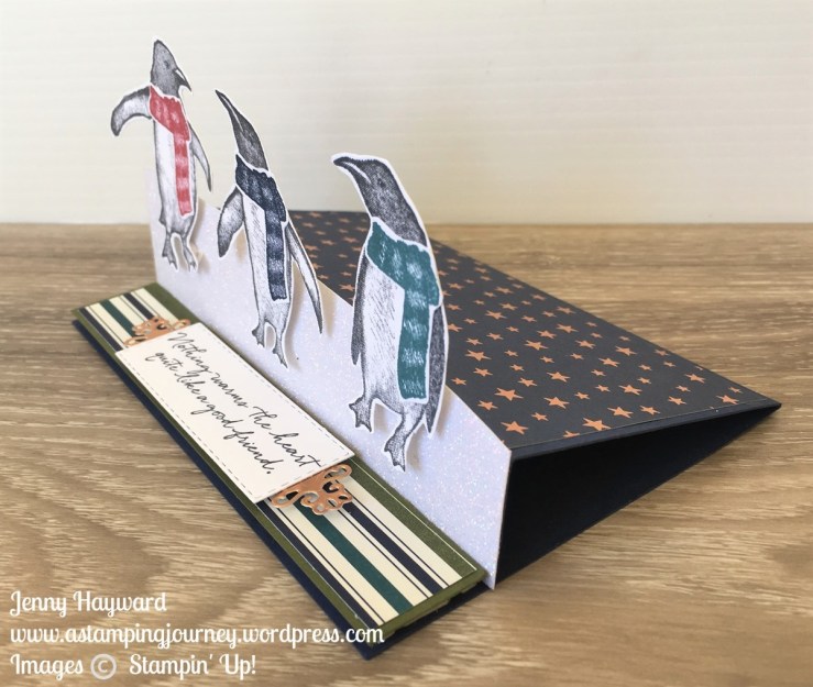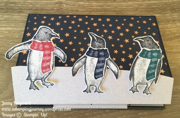 I cut a curved strip of Sparkle Glimmer Paper and adhered it on the folded tab. 3 Penguins were stamped with their scarves and then hand-cut and raised up off the Glimmer Paper. A piece of the Christmas Gleaming Designer Series Paper was adhered to the front of the card which you can see as the star pattern on the top panel.