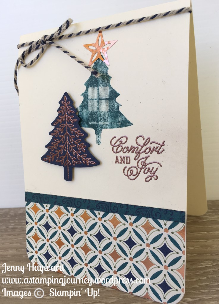 The Plaid tree was stamped with Pretty Peacock directly on to the Vanilla card base. The other tree was heat embossed in Copper on to Night of Navy card and punched out with the Pine Tree Punch. This tree is raised up with Dimensionals.