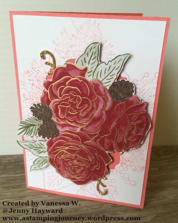 This first card was created by Peta one of my team members. I received this as a swap for Onstage in early November but hadn’t shared it with you yet. The copper makes it very classy. She used the Stitched Rectangles Dies to create the card mats for the gorgeous array of flowers.