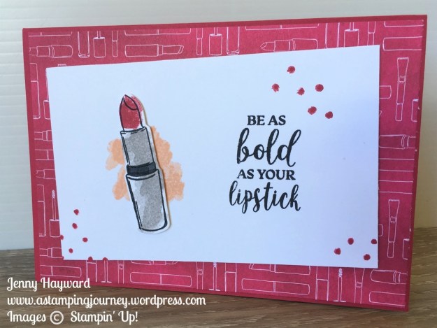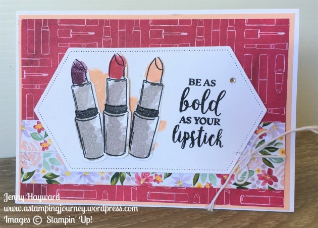 The card above is still simple in design but uses a little more products. The paper adds an extra touch to the card but is still affordable. Limited tools are needed to make the card. By layering the lipstick this will add some dimension to the card. The lipstick is easy to fussy cut if the crafter doesn’t have a die-cutting machine.