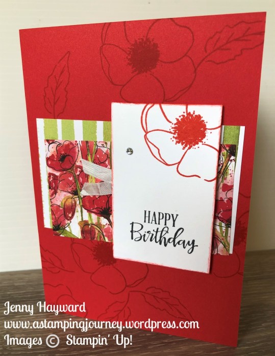 On a piece of white card I stamped a poppy just off the top edge of the card and then added the Happy Birthday from the Peaceful Moments stamp set. I lightly sponged some Poppy Parade ink around the edge of the card. I haven’t done that for a very long time. I used to add it all the time but now I tend to leave the card clean – if I can describe it like that.