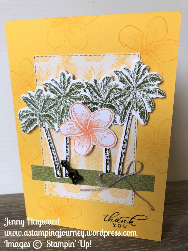 The card is just a little stamping with the Timeless Tropical stamp set and then diecutting. Easy with the co-ordinating In The Tropics Dies. I find it easiest to adhere the little Trinkets on with Glue Dots.