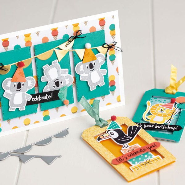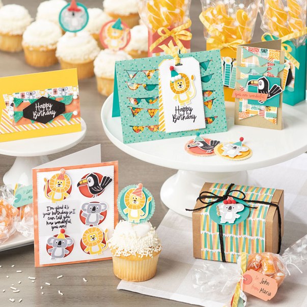 The Birthday Bonanza Suite Bundle is perfect for birthday cards, treat bags, and parties for all ages.The stamp set includes adorable koalas, toucans, lions, banners, birthday presents, and balloons. The full Suite is $122.25 AUD.