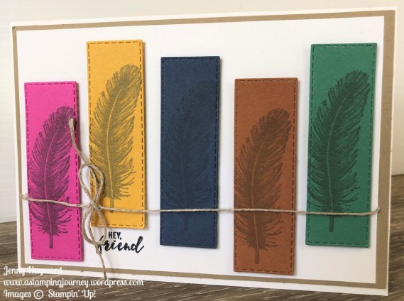 I have used the feather from the Tasteful Touches stamp set and stamped them on each In color card in Basic Gray. Then they were diecut with one of the rectangle dies in the Stitched Rectangles. Rather than adhere them in a straight line I thought it would be fun to stagger them on the card.