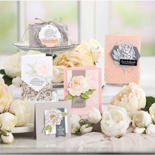 We have the Peony Dies. There are some that diecut the flower images from the stamp set and some that cut and build the peony flower. Check the sample further below. There is a way of building the flowers up using the dies. Play around with them and have fun creating your flowers.