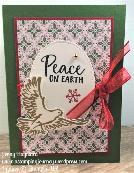 It’s simple in design but the dove is heat embossed in Gold and diecut. Great to have the matching Detailed Dove Dies. The gorgeous Real Red Sheer Ribbon is beautiful and soft and so easy to tie bows. The ribbon was wrapped around the card mat and paper piece before adhering it to the Garden Green card base.