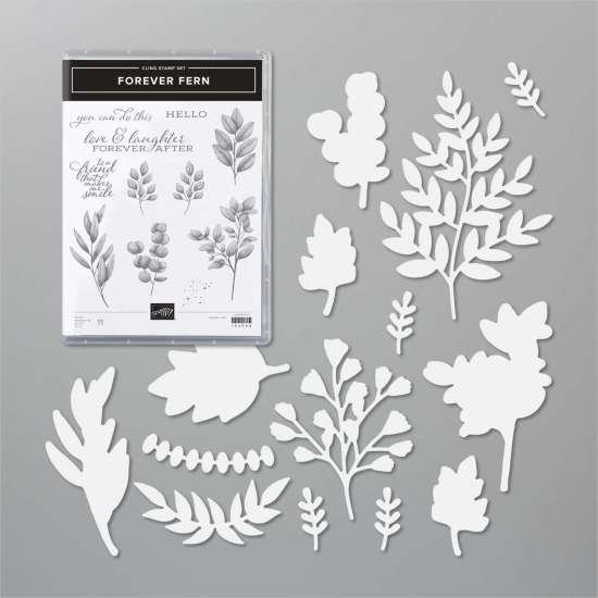 The Forever Fern Bundle includes the Forever Fern Cling stamp set and the Forever Flourishing Dies. The Dies contain 14 dies of all different leaf shapes. How fun are the Leaves to layer together.