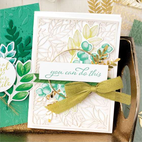 On this card below it shows the Greenery Embossing Folder but check the hoop out on this card. It encircles the sentiment.
