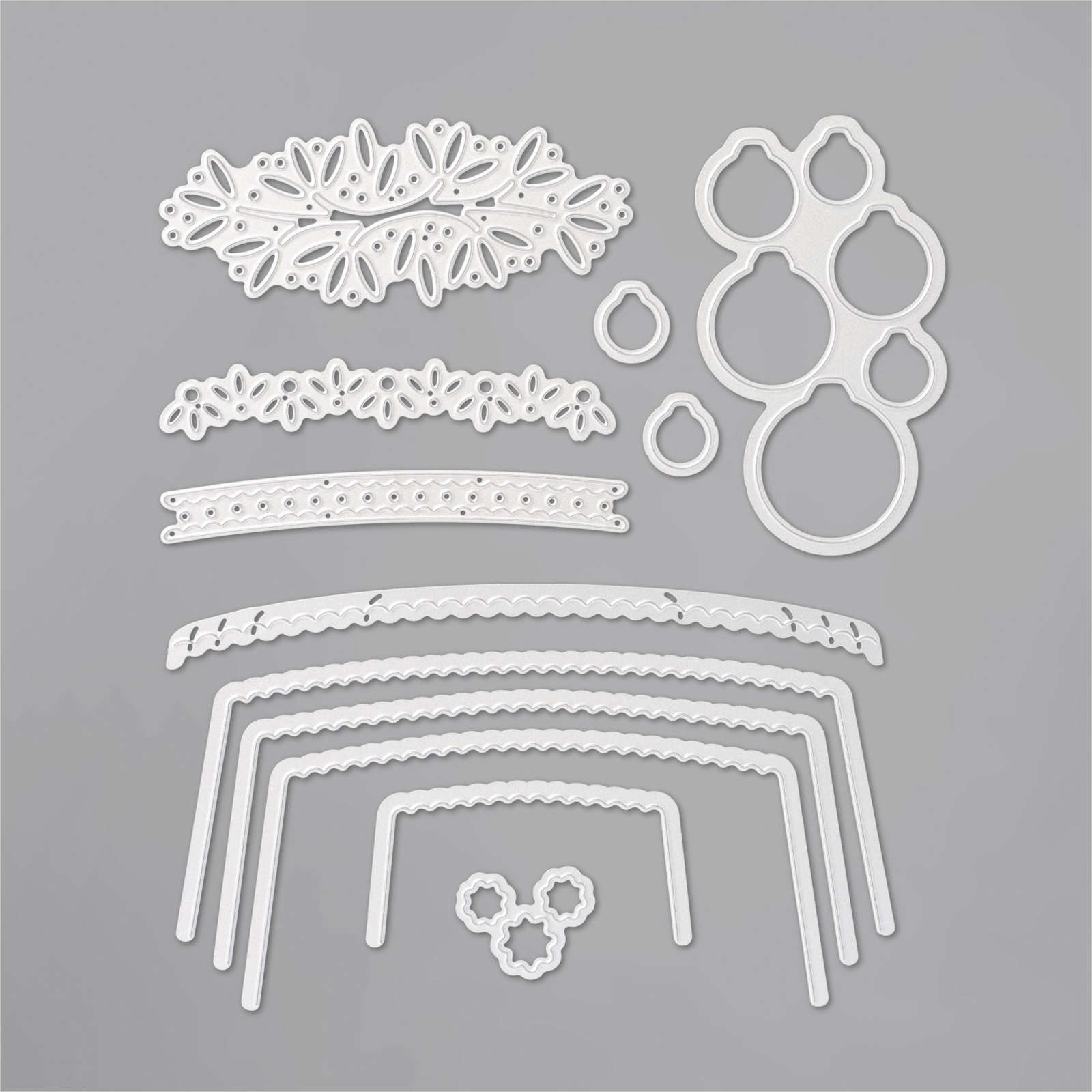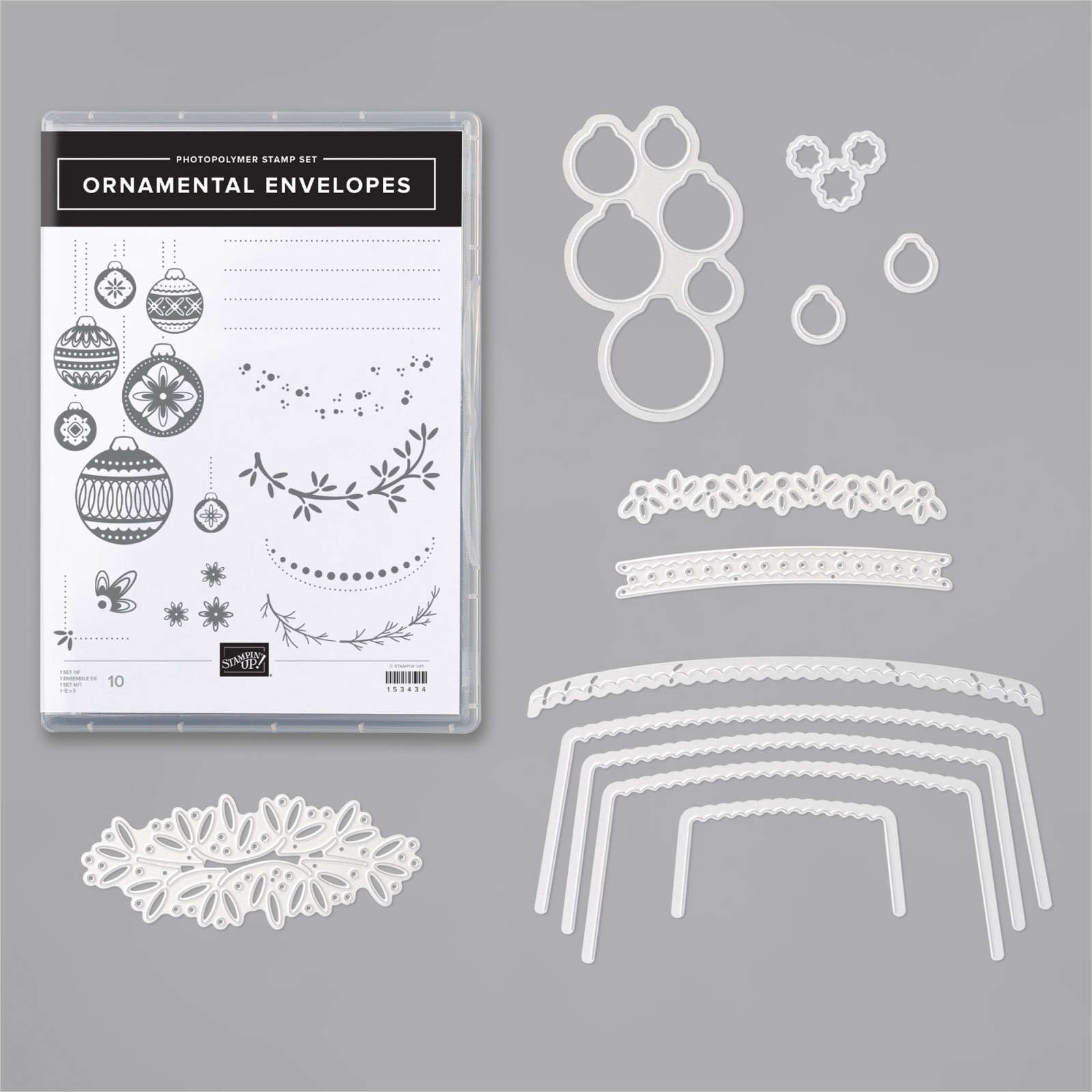 The Envelopes Dies consists of 12 dies. 4 Envelope liners, 1-2 decorative edges, and some other elements to diecut in to your paper liners or directly on to the envelope. It also has the dies to cut the ornaments from the stamp set too. The Largest die measures 6-3/16″ x 2-1/2″ (15.7 x 6.4 cm).