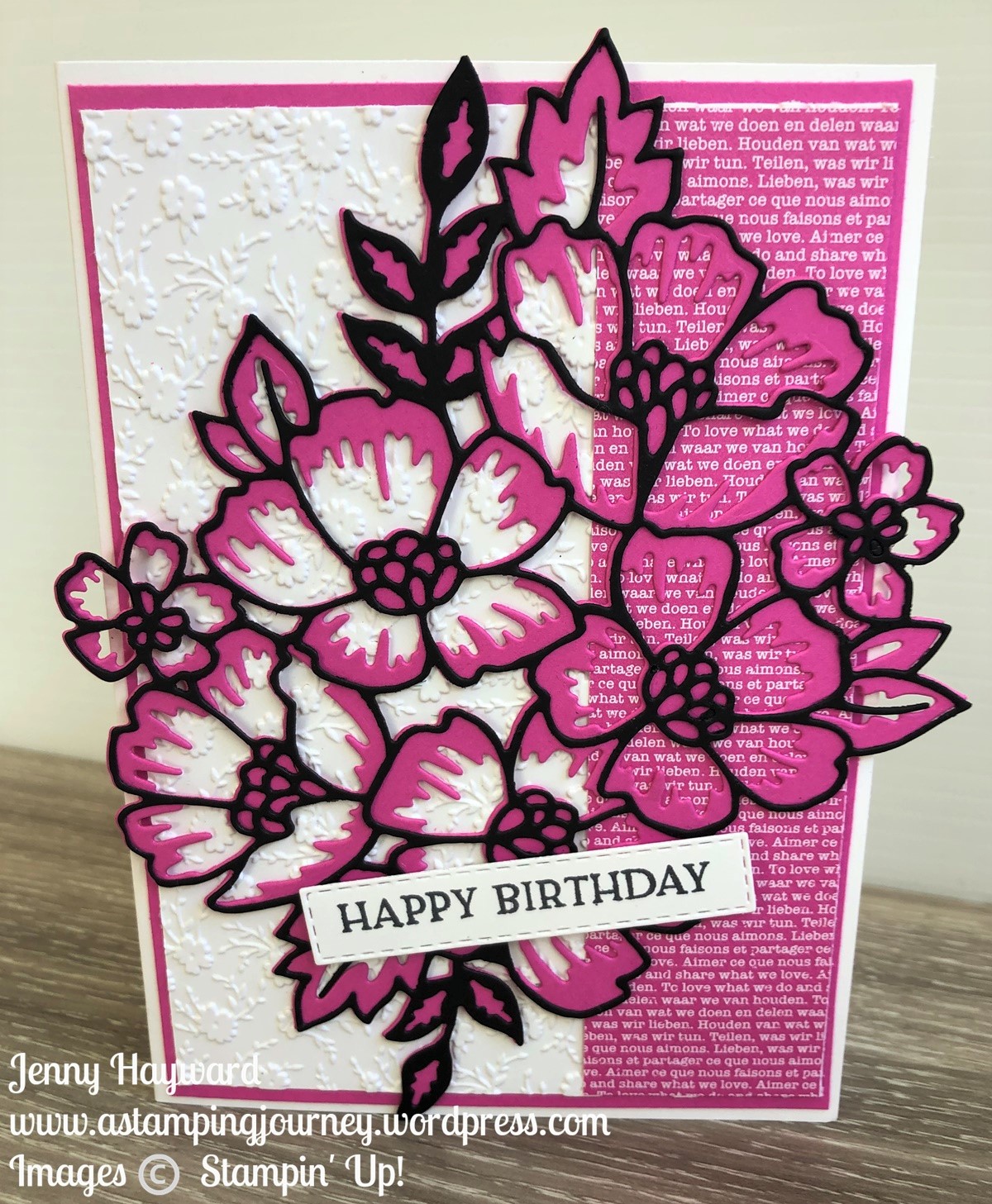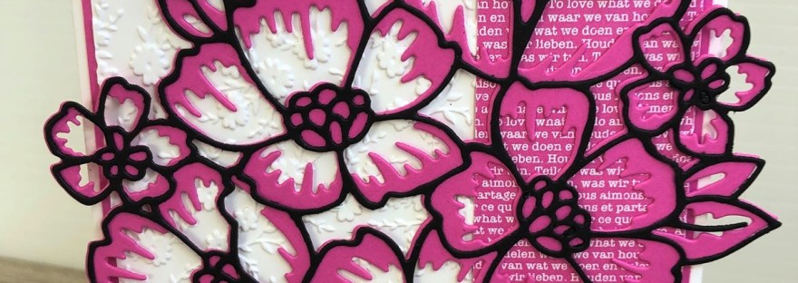 I have used the beautiful Many Layered Blossoms Dies. I used them so much a few months ago and then new shiny toys arrived. This one the the “wider” flower die was diecut in Magenta Madness and then the “fine line” die was diecut in Black and then layered together.