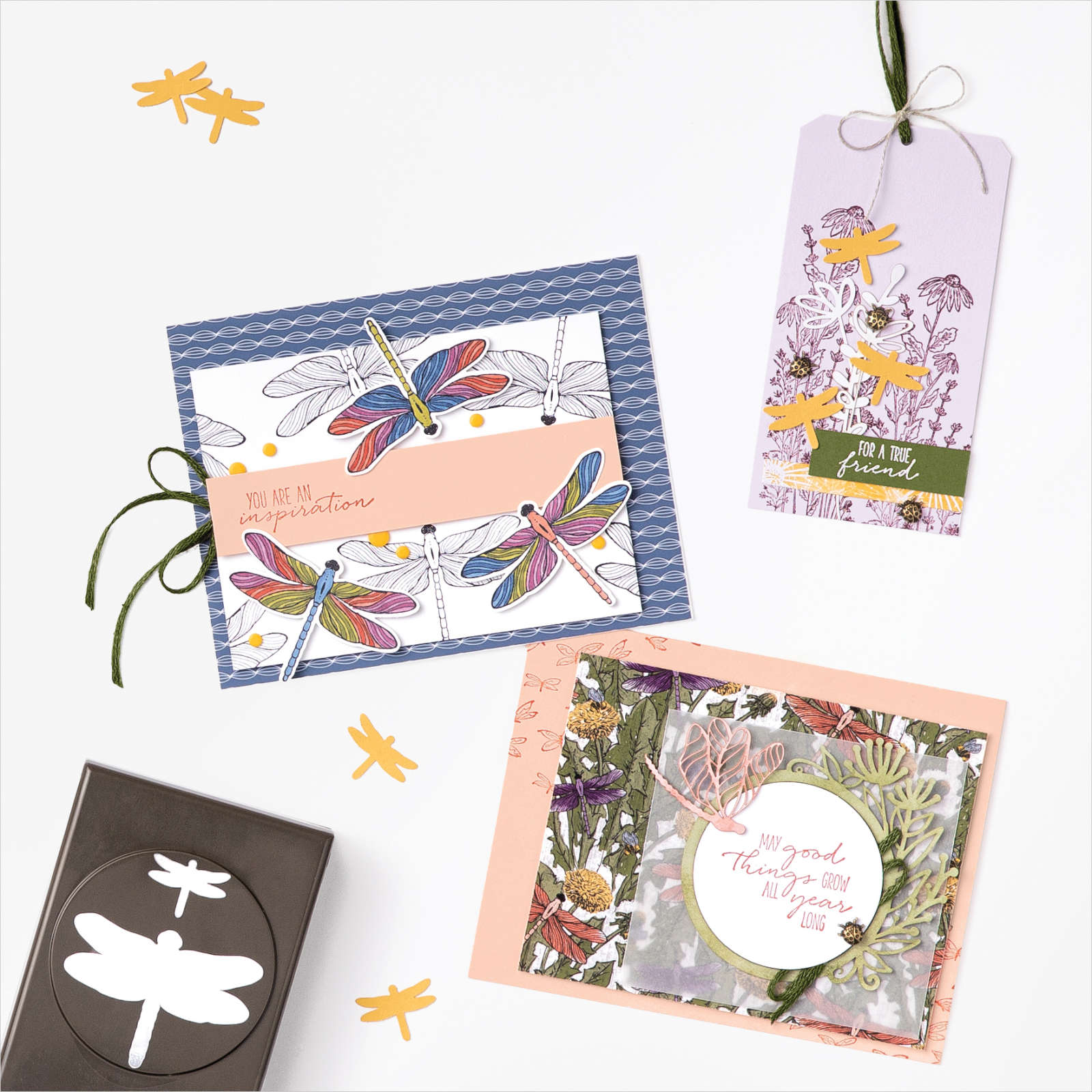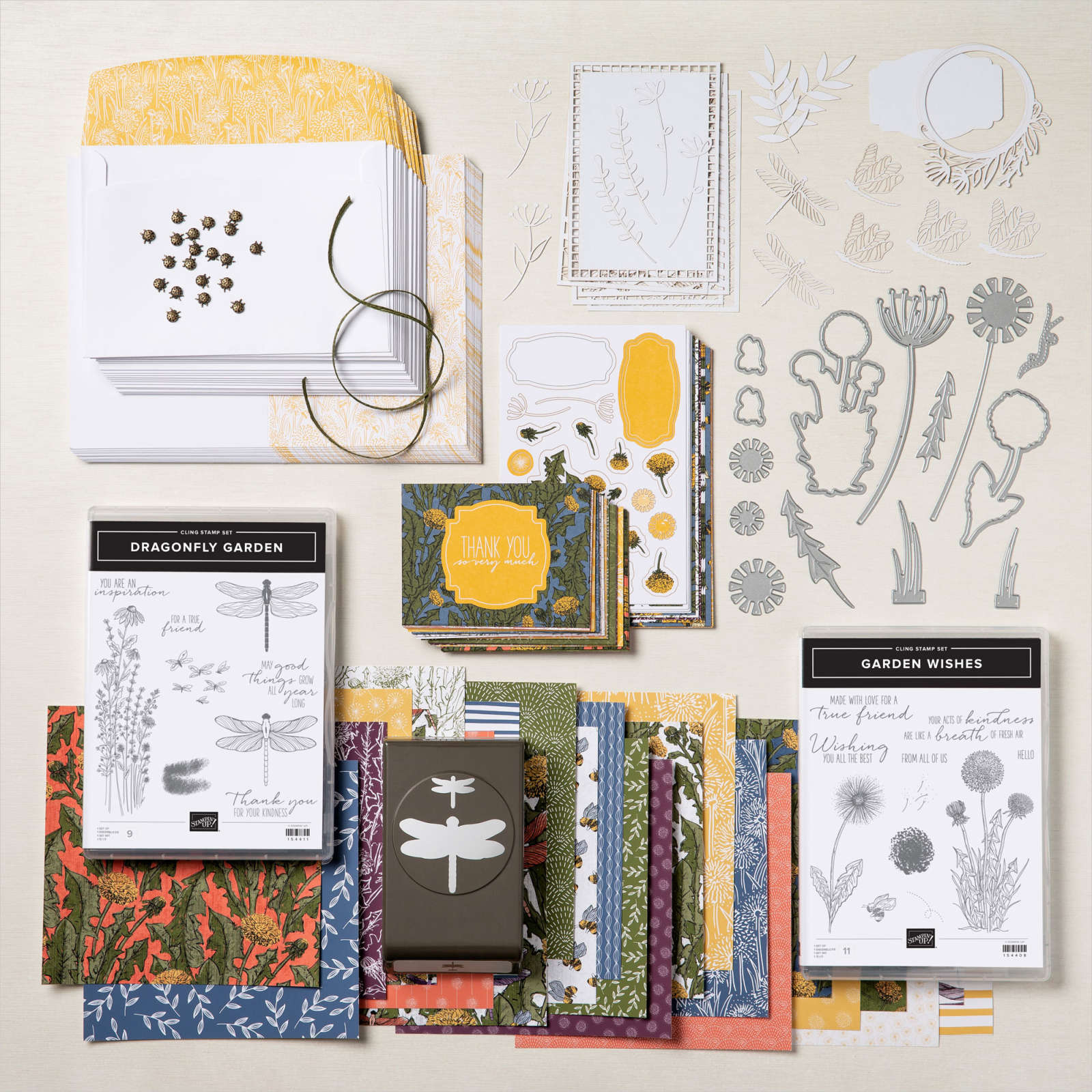 There are 2 bundles available in the suite. The Dragonfly Garden which has a stamp set and punch. And the Garden Wishes Bundle which has a stamp set and dies. Both very gorgeous and also work together well. I think the Garden Wishes bundle would work really well with the Dandelions 3D Embossing Folder available in the Annual Catalogue.