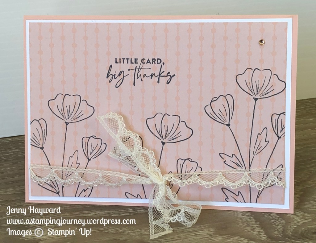 The flowers were stamped on the Petal Pink print in the Subtles Designer Series Paper stack. The great thing … you don’t have to colours the flowers. That makes for such a quick card.