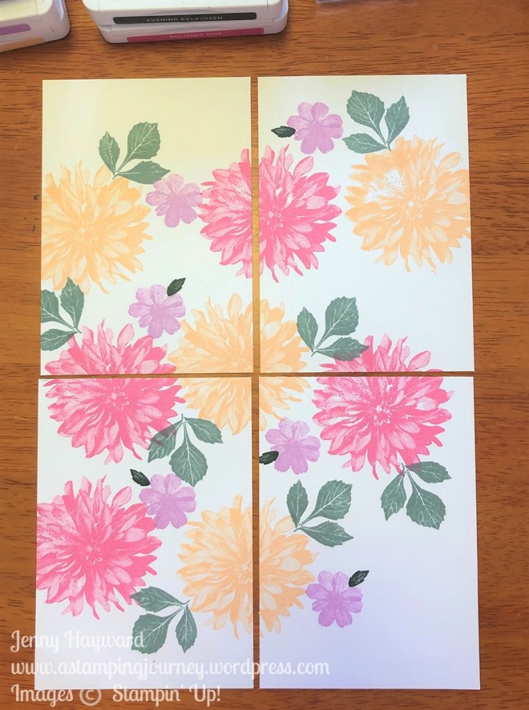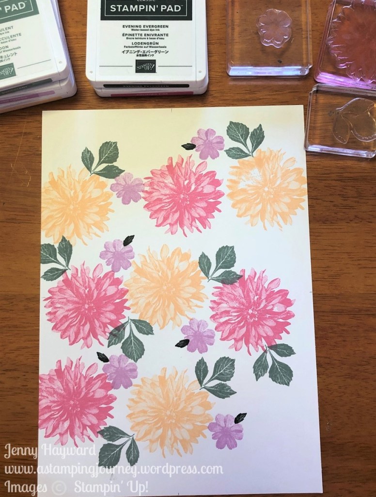 I have used the Sale-A-Bration set Delicate Dahlias for this one and used the new 2021-2023 Incolors – Fresh Freesia, Pale Papaya, Polished Pink, Soft Succulent and Evening Evergreen.