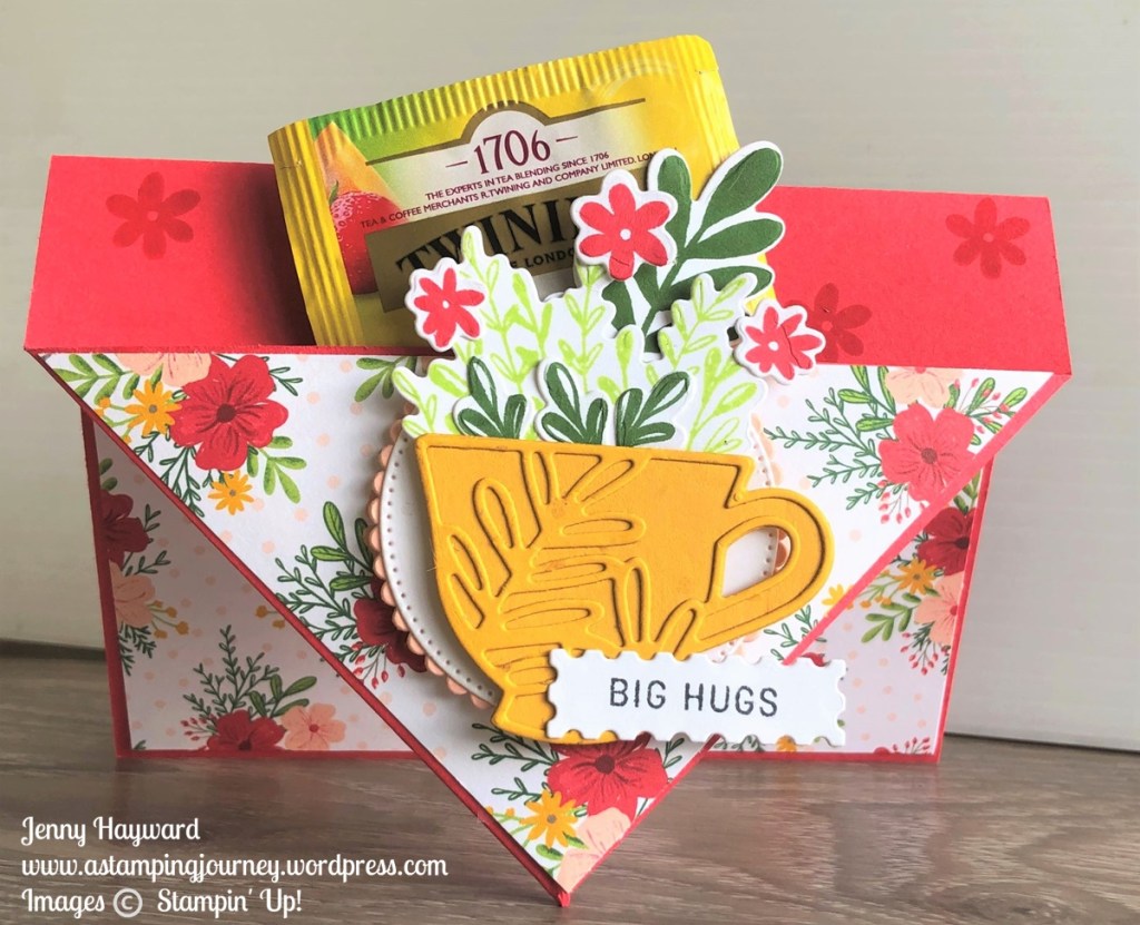 It’s a standard size card and with a little folding and scoring creates a pocket in the front. Just the size for a tea bag, Gift Card or even a small chocolate.