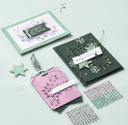 Diecut them and just gently lift the edges. Use the spatula end from the Take Your Pick Tool or use the Paper Piercer. It’s a cool effect with those slightly raised edges and adds just another dimension to your projects. With the Joyful Flurry Stamp Set you have added snowflakes but the sentiments are so soft and “magical”.