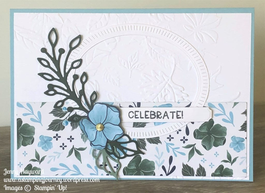 The white background is embossed with the Leaf Fall 3D Embossing Folder. And – save on colouring the flower. You can easily snip it from the pretty Fitting Florets Designer Series Paper. Some of the dies from the Framed Florets Dies do cut some of the flower images but not this particular one.