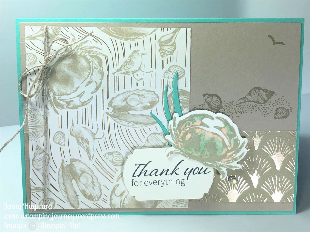 I stamped the crab in Sahara Sand and coloured it with the Petal Pink and the Mint Macaron Stampin’ Blends.