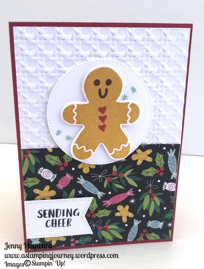 The white card is embossed with the Cane Weave 3D Embossing Folder. The paper is the retired Celebrate Everything Designer Series Paper. It worked so well with the gingerbread.