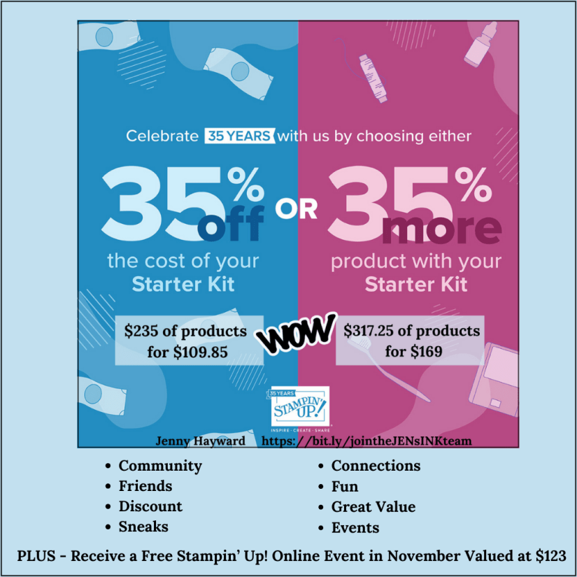Purchase the Starter kit of products of your choice when you Join Stampin’ Up! in October. To celebrate Stampin’ Up!’s 35th Birthday get 35% off or 35% more.
