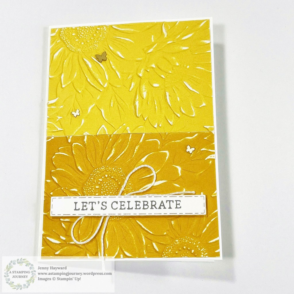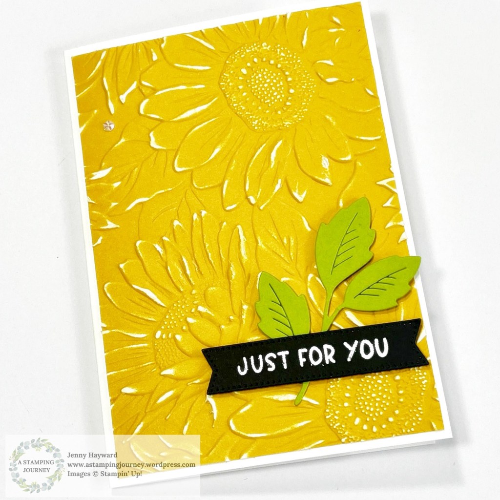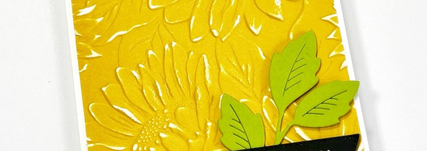On this one below I cut a piece of the Two-Tone Daffodil Delight and embossed that. I lightly sanded the piece and added it to a white card Base. The sentiment heat embossed in white on black card and the Granny Apple Green leaf gives a ‘POP’ to the card.