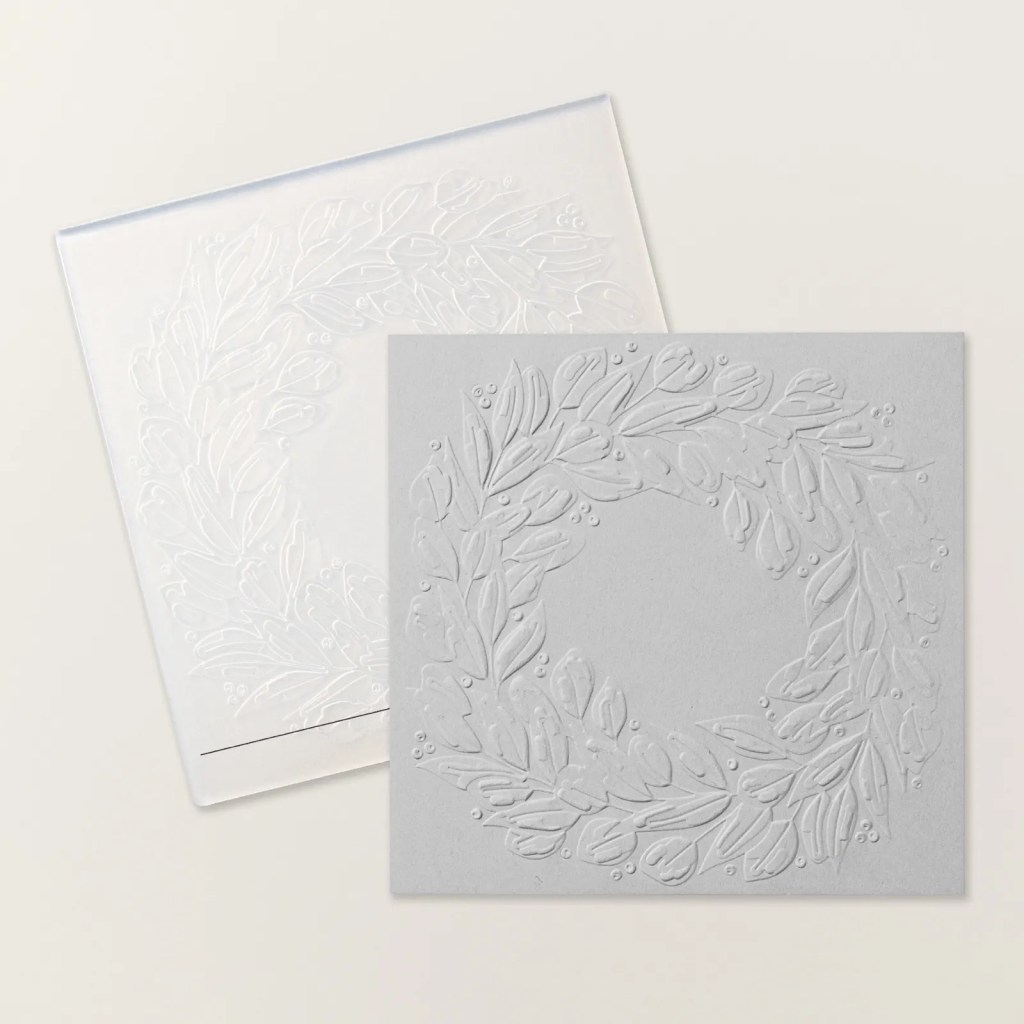 The Traditional Wreath Embossing Folder. Note this Embossing Folder is very large. It is 6″ x 6-1/4″ (15.2 x 15.9 cm). So bigger than your standard Card Size you would just have a touch of texture on it. It is pretty though with lots of detail.