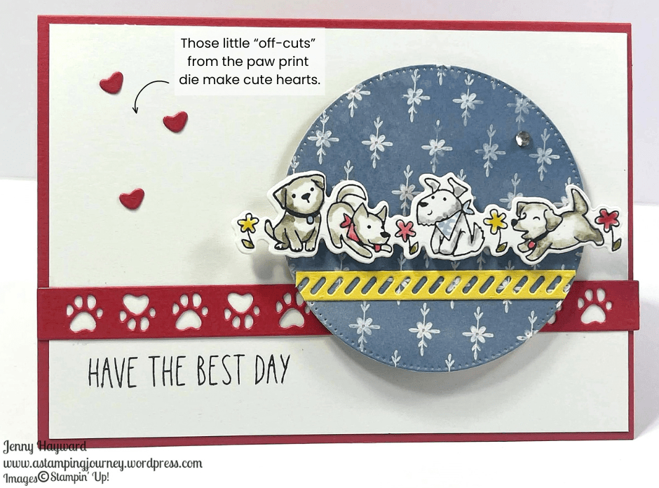 Something I discovered though. When I diecut the red paw print strip those larger “bits” looked like hearts. So I added them to the card. It just adds to the cuteness. Don’t waste those little hearts.