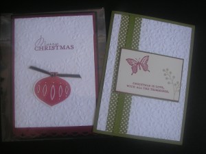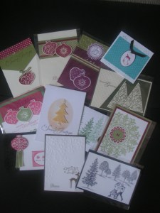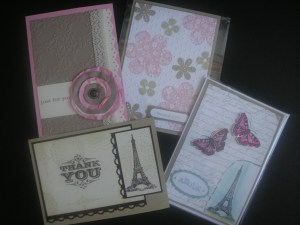 Just going to interrupt my regular programming of ‘Sail-Away’ cards for the moment. (Phew, you’re all breathing a sigh of relief there aren’t you!!!). I had to show you these cards. Today I had a family stamping day with some of my keen stamping family members. I showed them the Emboss Resist Technique with ‘Elements of Style’. Then they all made the card. They all did a fantastic job. I thought you might like to see them. I’m very impressed with them all.