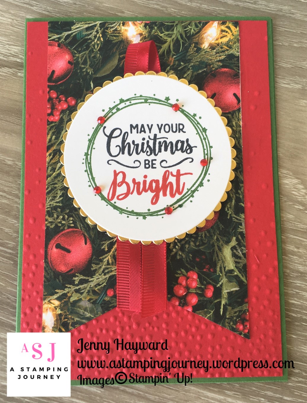 The card base is Garden Green. The red card mat was embossed with the Softly Falling Embossing Folder.The piece of All is Bright Designer Series paper which is about 7.5cm wide (3″) was cut to a banner ends with scissors. The circle wreath from the Making Christmas Brightwas stamped in Garden Green. The sentiment was stamped in black and the Bright was stamped in Real Red. I added some Red Rhinestones for dress up the wreath. This circle wreath was adhered on to a scallop circle in Gold Foilcut with the Layering Circles Framelits. Before adhering this piece to the card I added some Red Satin Ribbon hanging from behind it.