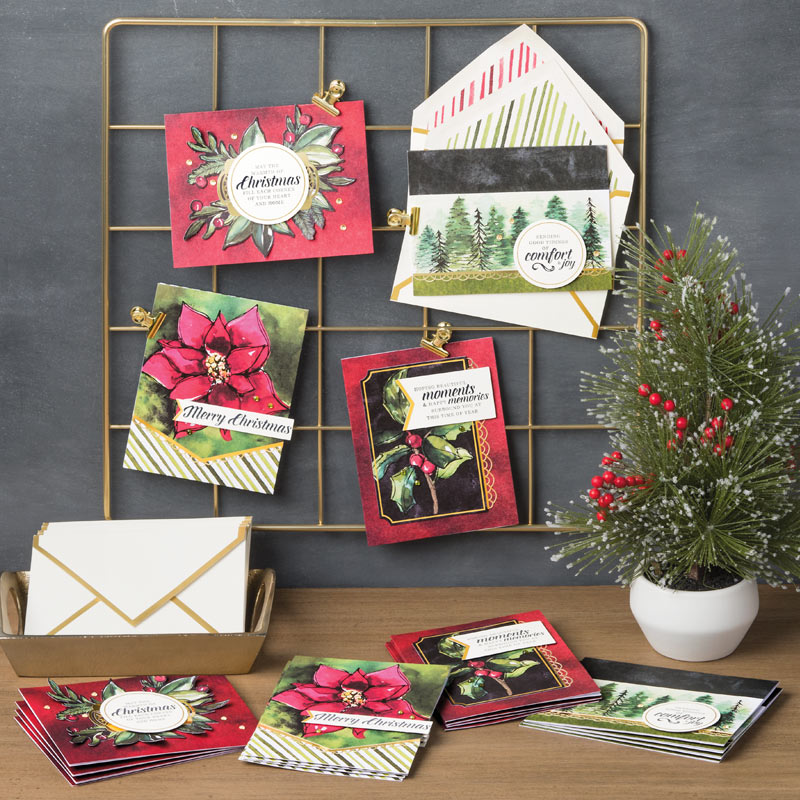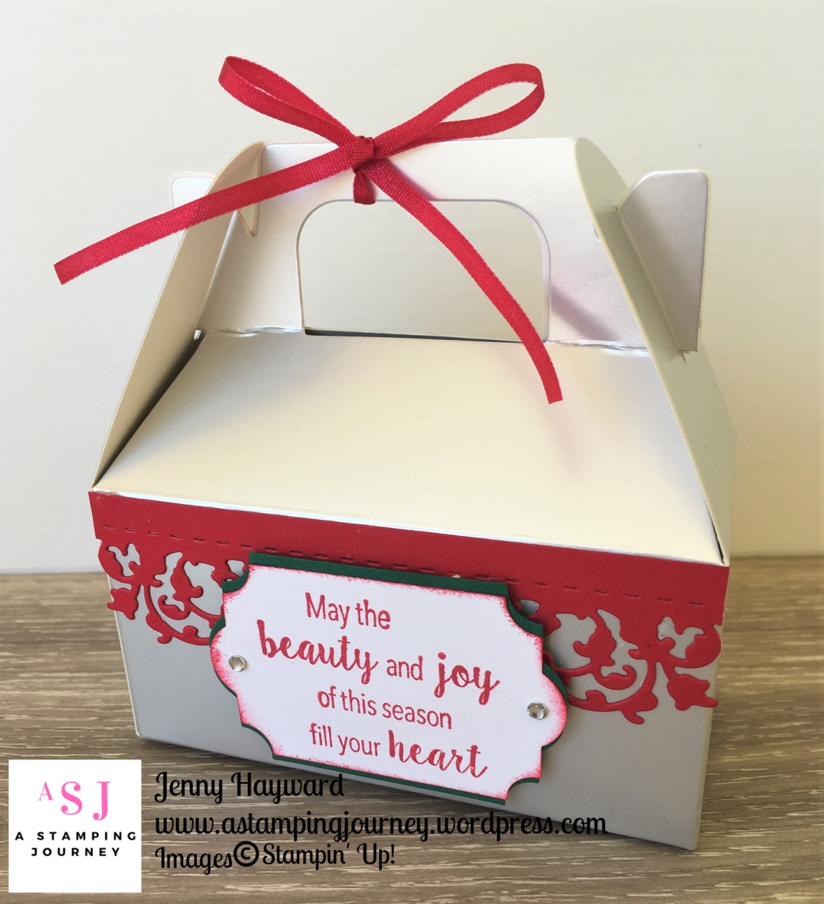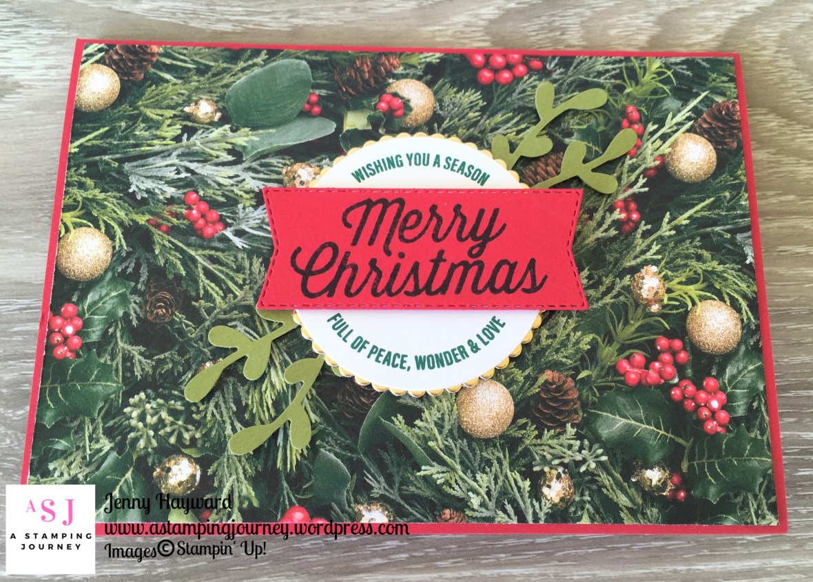Now we have a happy Pelican. This one was stamped on Shimmery White and coloured with Watercolour Pencils. The sentiment was stamped on Pear Pizzazz and cut with the Stitched Shaped Framelits. I also cut a scalloped circle from the Layering Circles Framelits from Silver Glimmer Paper to adhere underneath this one. The white card was a bit plain so I added some “spots” from the Farmhouse Christmas set that I had out on my desk still.