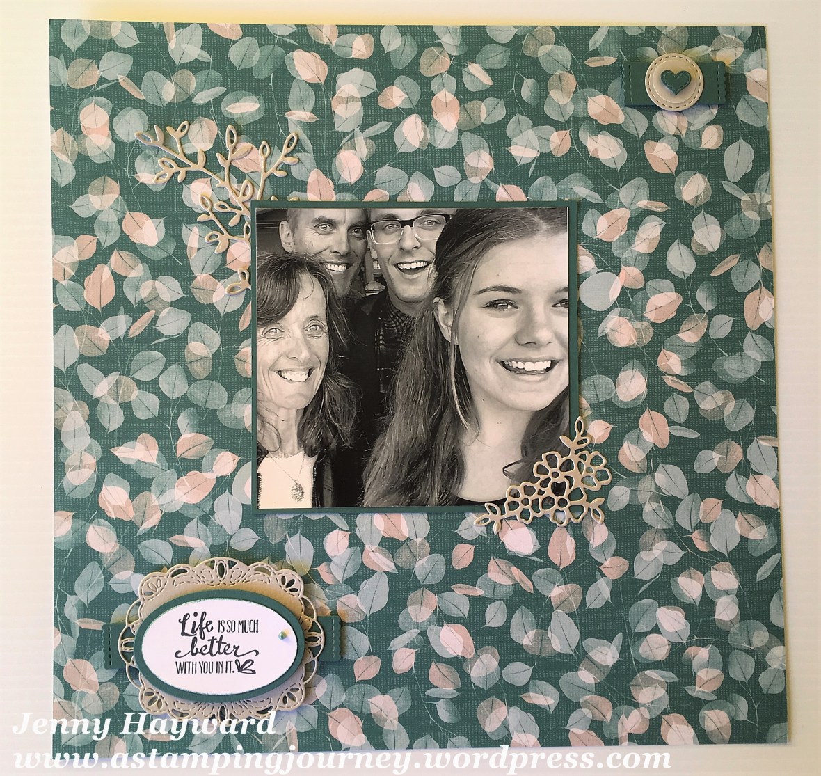 Choosing the photo was the easy part but working out how to put it together took a little time. I first went through some scrapbooking page ideas I had pinned on Pinterest. I also looked at some ideas I saved to my computer and in some magazines. I wanted to use some of the gorgeous Stampin’ Up! paper in some way. I had thought in strips. I tried a few sheets of paper that I had to see what worked. I found that this piece looked the best against the black and white photo. I thought I might cut it in strips with some other prints from the Nature’s Poem pack but I liked this piece left as it was.