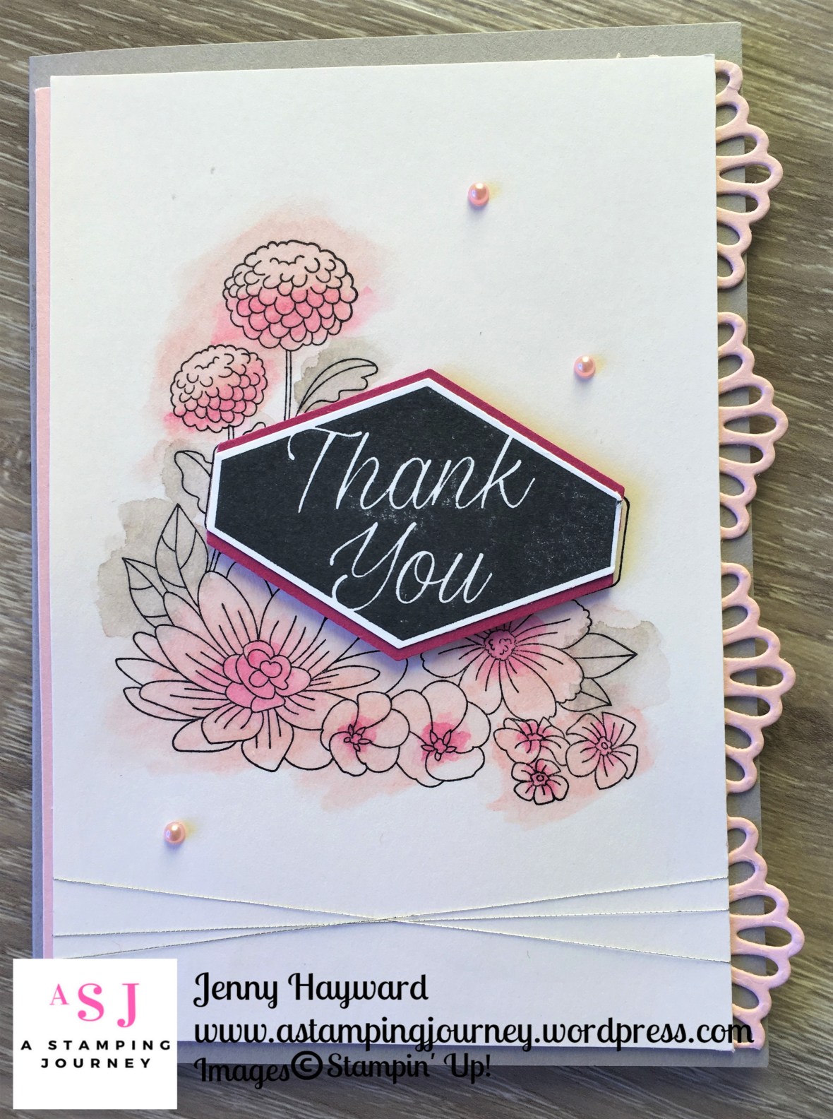 The sentiment is stamped in Black and punched with the Tailor Tag Punch. I punched another piece from Berry Burst card. Cut that piece in half horizontally then could layer it underneath the stamped piece so you see the little pink edge peeking out. I finished with some Artisan Pearls and some Silver Thread wrapped around a few times.