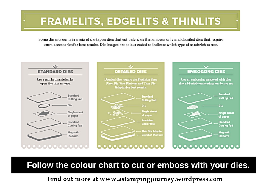 The Framelits, Edgelits and Thinlits are coloured coded in the catalogue (page 215-221) to show which sandwich to assemble on your Big Shot platform when cutting or embossing. Sometimes it can be confusing how to get the best result when you use your dies.