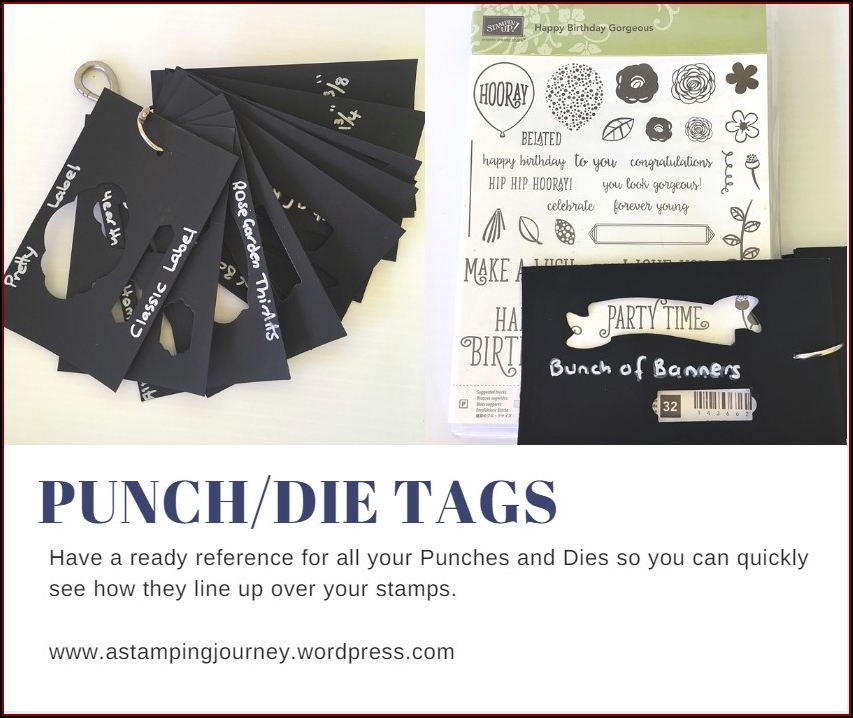 The tags are strips of Black card. They measure 7.5cm wide by 12cm long. (approx. 3″x 5″). You can make them any size you like. Punch a hole in the top of each card so you can loop the tags through a clip. Each year I update this with the current punches and dies.