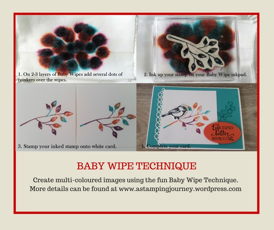 3. Stamp your inked stamp onto your card. If you are stamping multiple of images then clean your stamp and ink your stamp again between each one. Your Baby Wipe Inkpad should last quite a number of stampings. I think I got 15-20 from the one inked wipe.