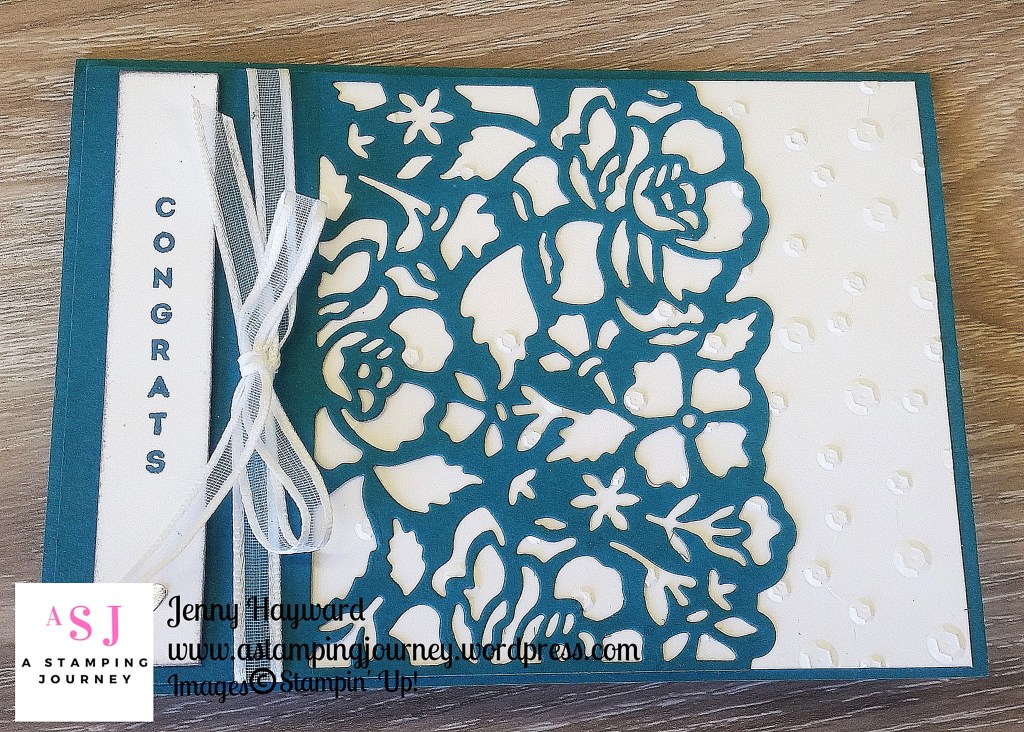 Adhere the Bermuda Bay card mat to a Thick Whisper White card base. Cut the circular Border Thinlit from the Petals and More Thinlits from Dazzling Diamonds Glimmer Paper and adhere down the left hand side of the Bermuda Bay Card. Adhere your stamped white card you had created with the Baby Wipe Technique on to the card. On the right hand side stamp the flower image from the Petal Palette set in Bermuda Bay ink.