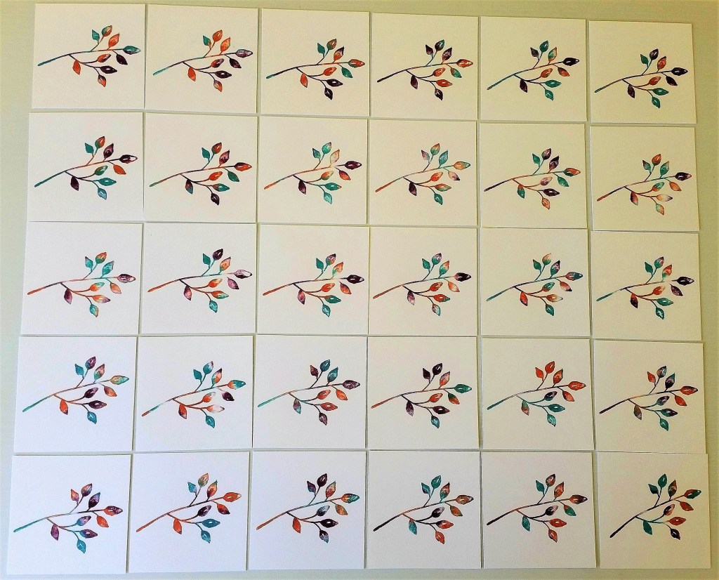 Just to show you how different they can be. Here is all the stamped pieces when they were done. I inked the leaf in different positions on the wipe at times to get the variations.