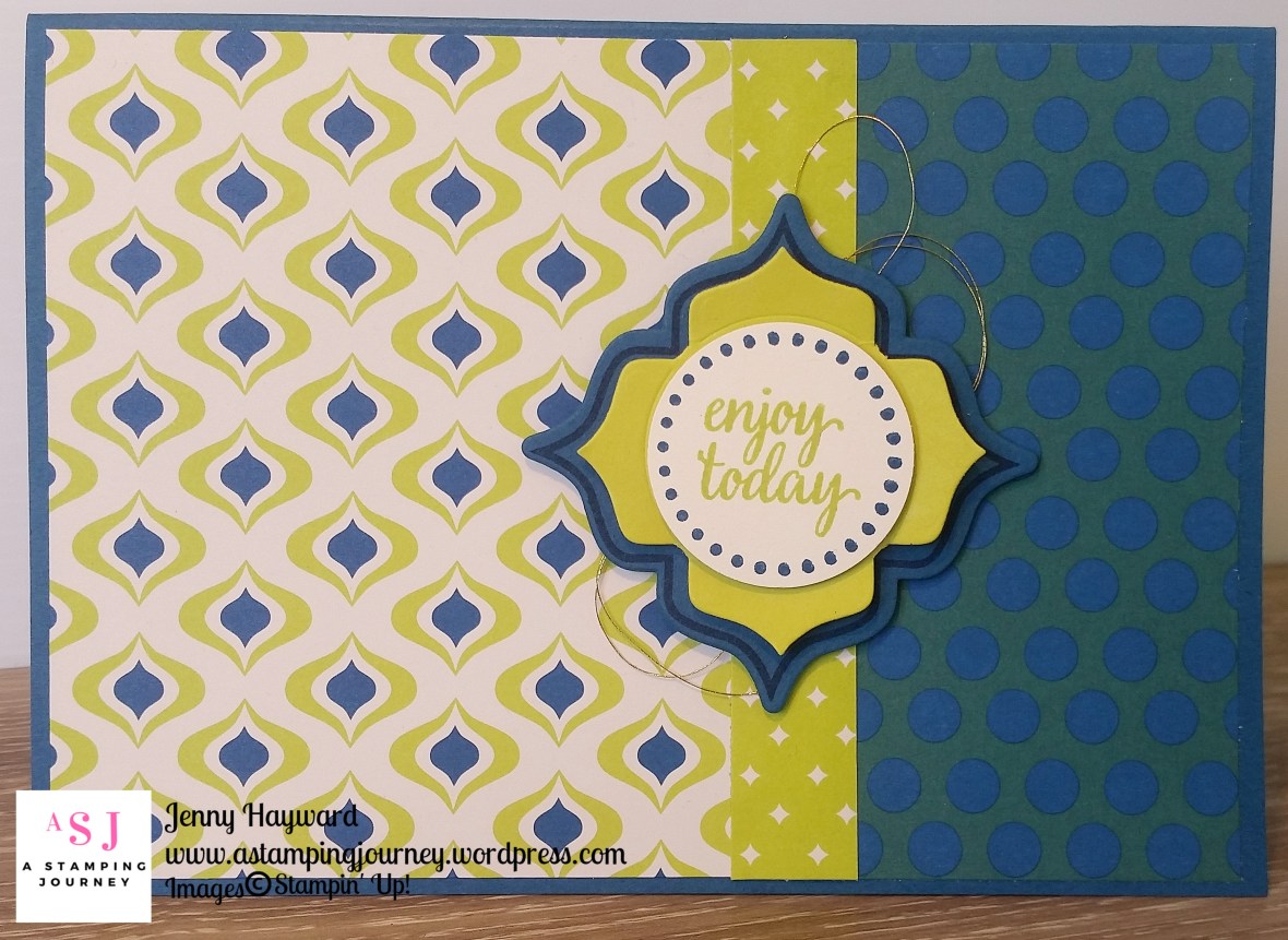 This next one is totally out of my comfort zone. Really, mixing 3 different patterns of paper!! But I think it works and I have to say I am happy with it. I think it works as there is just one strongly patterned paper and then the other 2 are simple patterns. It helps that the colours co-ordinate which is always a special feature of Stampin’ Up! Products.