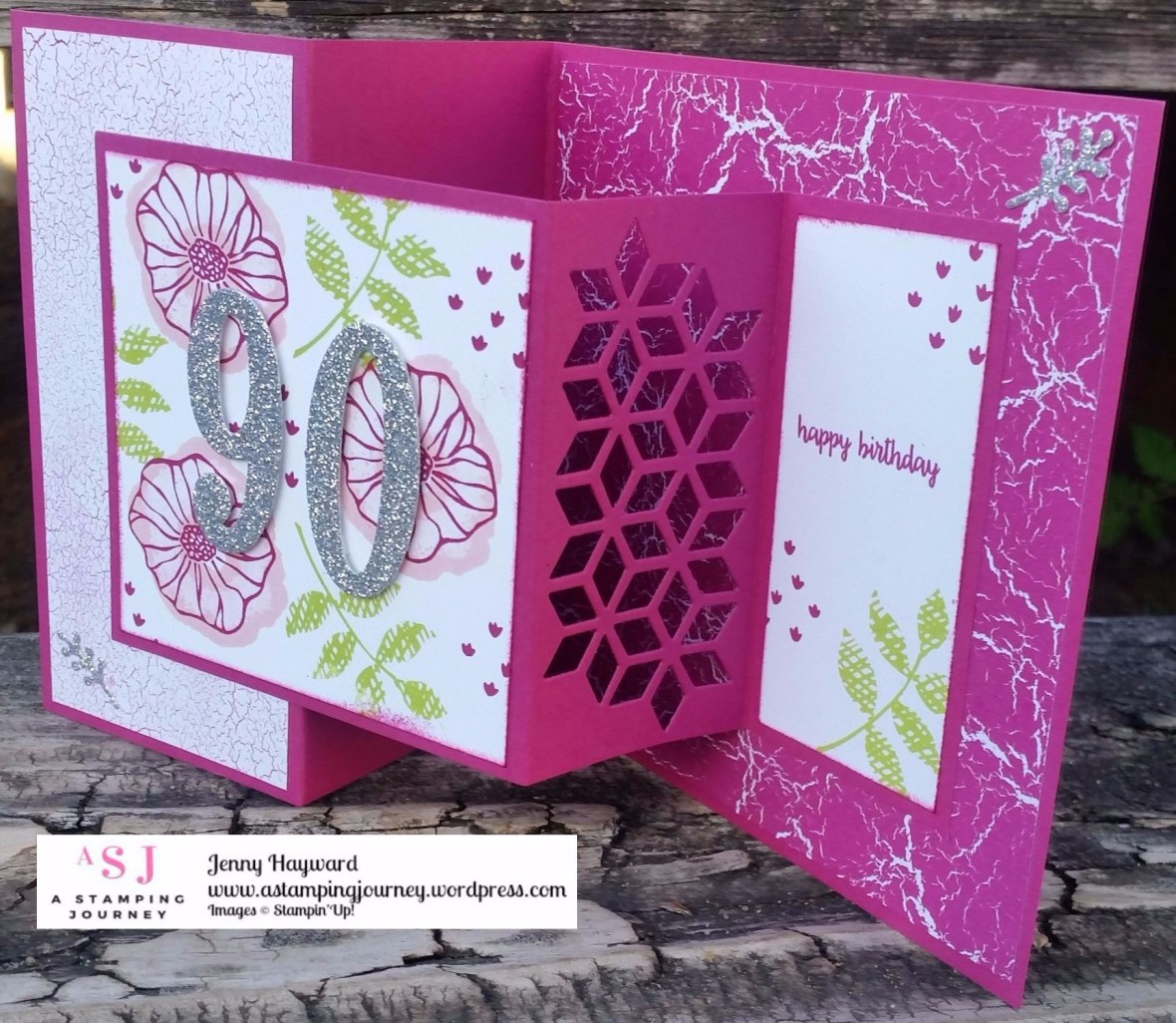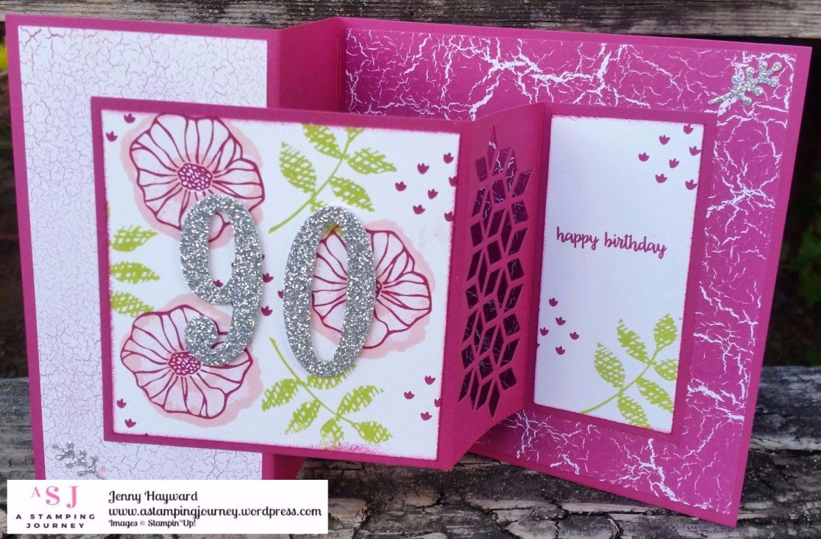 It is my Mother-in-Law’s 90th birthday today. We had a small family get together yesterday. I thought I would show you the card I made for her. She had put in a request for it to be in Berry Burst, her new favourite colour. The pressure was on as she expected a grand creation! I hope it made the grade. There were lots of Oohs! and WOW! so I think I might have made the grade. 🙂