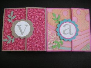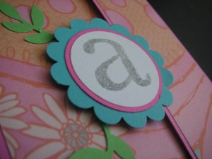 I used one of the new sets Printed Petals. This is such a versatile set. I stamped the small flower in versamark on the front. I stamped the large flower in Pretty in Pink and the smaller one in So Saffron. I cut these out and curled up the edges a little before raising them up on dimensionals. Some more bling in the centre of these flowers with the Rhinestones. The pink tag was cut with the Big Shot and the ‘Lots of Tags’ die. I adhered this straight onto the card. The greeting was from “Teeny Tiny Sentiments” stamped and punched with the small oval punch. I sponged the edges and raised that up with dimensionals. It is a very simple card. But it needed to be simple with so much else going on!!