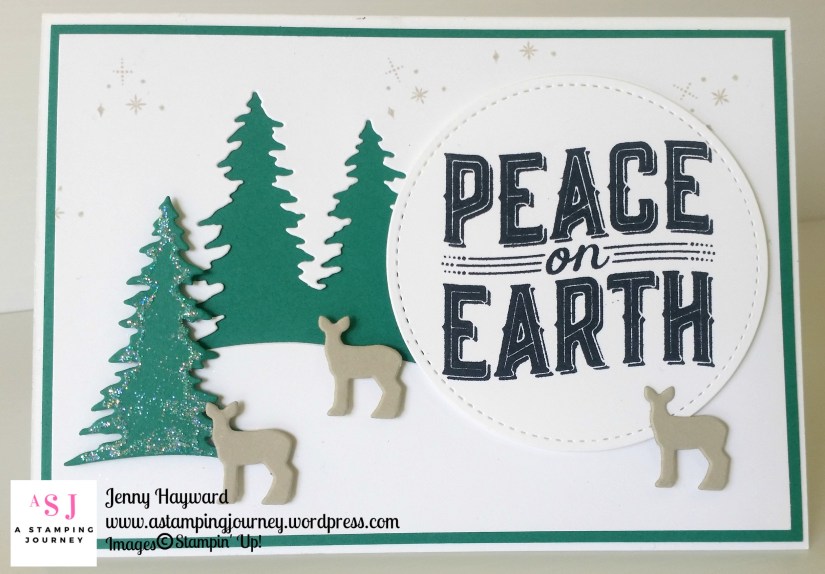 The double trees were cut from the White card mat and adhered to the Emerald Envy card mat. You can see the green trees through the cut window. Another tree was cut from a small piece of Emerald Envy and then raised up with Dimensionals. We added a little sparkle with the Dazzling Diamonds. You can just run around the edge of the tree with the Fine Tip glue and then sprinkle with the Dazzling Diamonds. The sentiment is cut with a Circle Stitched Shapes Framelit. And of course, don’t forget those cute little deers. These are cut from Sahara Sand card.