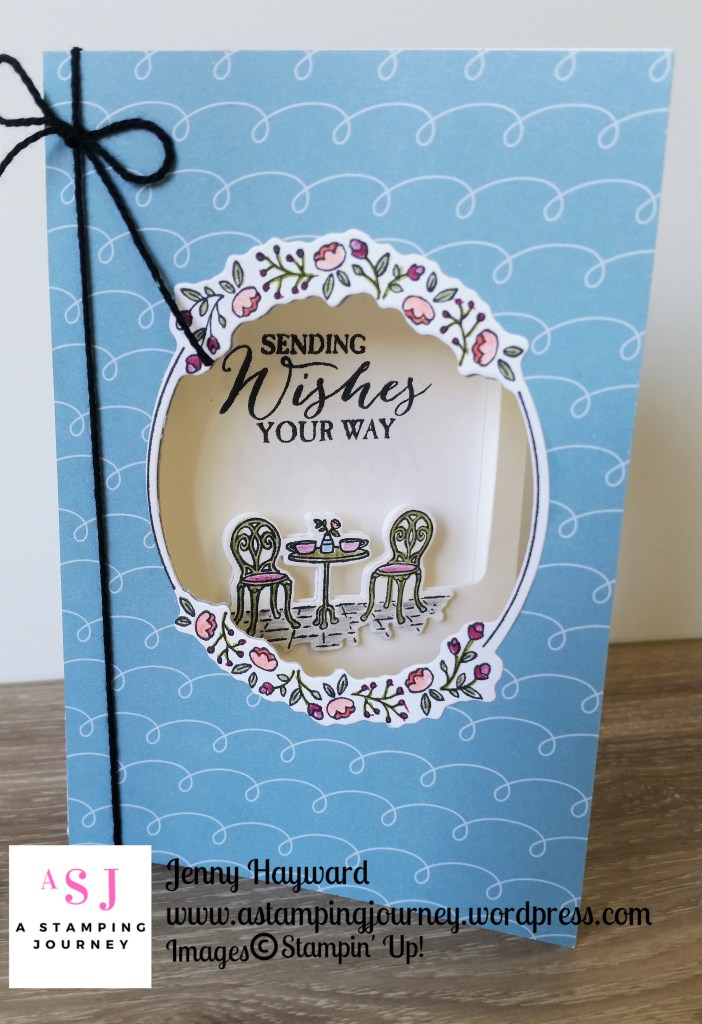 I cut the large Circle shape from the front which wouldn’t work trying to adhere the diecut flower circle on it. So I added one flower strand to the top and stamped the chairs and sentiment inside.