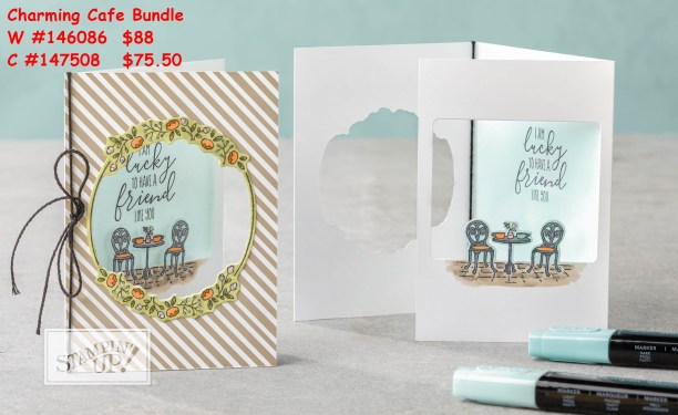This is the Bundle shown in the catalogue on page 25. It has the really sweet Charming Cafe stamp set and the Cafe Builder Framelits.